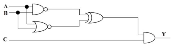 三、下方之數位邏輯電路圖,有 A、B、C 三個輸入變數,一個輸出變數 Y,請依下列數位邏輯電路,列出此邏輯電路的真值表(truth table),並依真值表推導輸出 Y 的結果。(25 分)