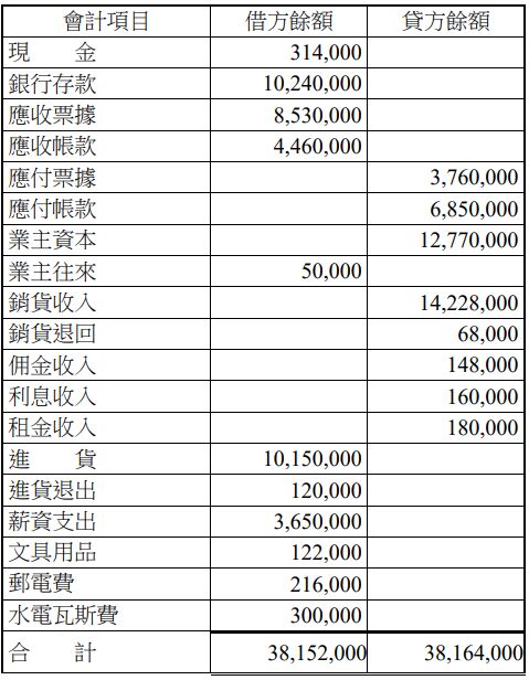 三、台中商店採定期盤存制,會計人員編製113年7月31日之餘額式試算表,發現借貸不平衡如下: