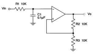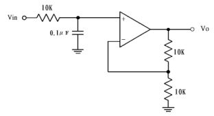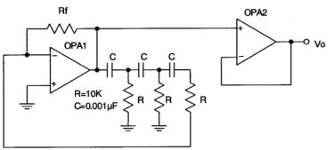 61. 下圖為一個 RC 相移振盪器,設 C 均為 0.001μF,R 均為 10KΩ,其 Rf的值應該為多少才能符合振盪的要求?