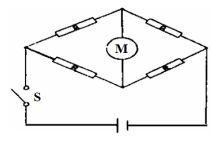 7. 一電路如下圖,如各支電阻 R 均相等,當開關 S 接上時,則電動機 M 將