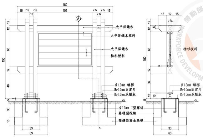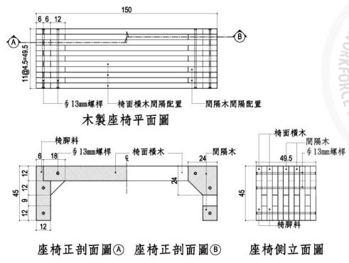 (A)所需螺桿數量為 6 支 (B)所需螺帽為 12 枚 (C)為避免固定螺桿凸出椅面,螺桿長度應少於 45 ㎝ (D)木料應進行防腐處理 。