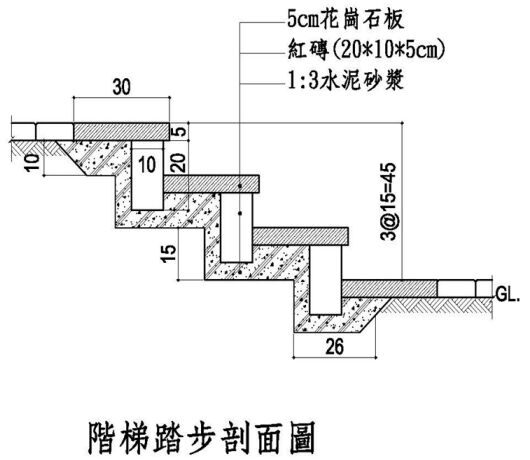 (A)每一踏步的級高為 15 ㎝ (B)紅磚間水泥砂漿勾縫應大於 2㎝ (C)如紅磚間的砂漿勾縫寬度為 1 ㎝,則約需紅磚 60 塊 (D)如踏步寬度為 365 ㎝,花崗石長度為 60 ㎝,砂漿勾縫寬度為 1 ㎝,則需花崗石 24塊 。