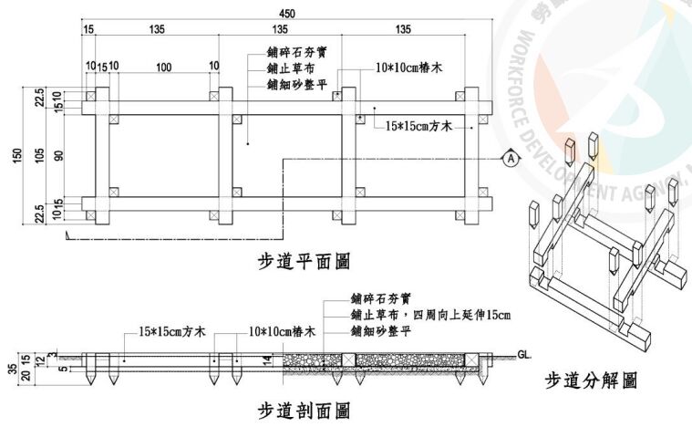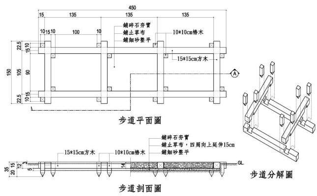 (A)依圖示規定,可使用圓木取代方木 (B)步道作法在設計時,可使用圓木樁取代方型樁木 (C)止草布約需 5.4m