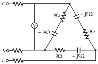 25. 如右圖,三相平衡電源,負相序 abc, 線電壓VL =V ,求交流電壓表數值為? [台中捷運111] (A)V (B)V (C)V (D)V
