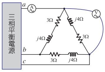 36. 如下圖所示電路,其中為理想的電流表及電壓表,若電流表指示 值為 8.66 A,則下列敘述何者正確? [統測 113] (A) 負載的總平均功率為 225W (B) 負載的總虛功率為 325VAR (C) 負載的總視在功率為 395VA (D) 電壓表指示值為 60V