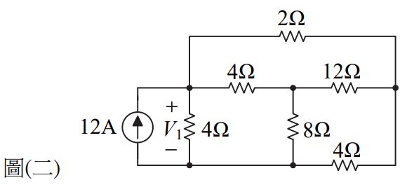 4. 如圖(二)所示電路,電壓V1為何? (A)12 V (B)16 V (C)20 V (D)24 V