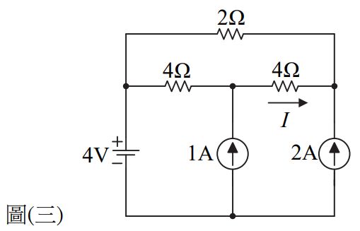 5. 如圖(三)所示電路,電流I為何? (A)-1 A (B)0 A (C)1 A (D)2 A