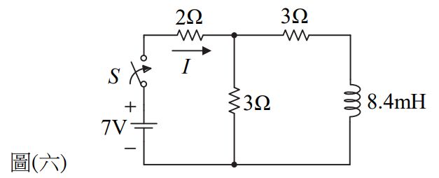 10. 如圖(六)所示電路,當開關S閉合20 ms後,流經2 Ω電阻之電流I約為何? (A)1 A (B)2 A (C)3 A (D)4 A