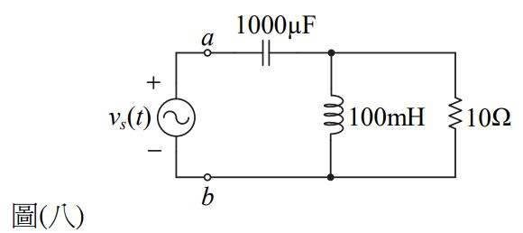 13. 如圖(八)所示RLC串並聯電路,若 vs(t)=10sin(100t)V,則a、b兩端的總阻抗為何?(A) 5+j 5Ω(B) 5–j 5Ω (C) 10+j 10Ω (D) 10 –j 10Ω