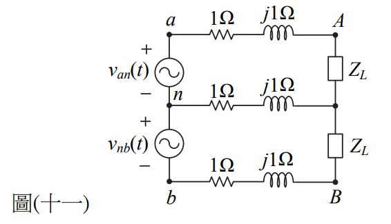 17. 如圖(十一)所示單相三線式供電系統,電源 van(t)=vnb(t)=110sin(377t)V,經三條線路供電至負載,若負載 ZL=7+j5Ω,則三條線路之總損失為何? (A)121 W (B)242 W (C)363 W (D)484 W