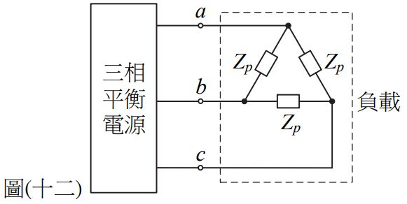 18. 如圖(十二)所示三相平衡系統,負載端電壓有效值為300 V,若Δ接負載總消耗功率為3600 W,功率因數為0.8落後,則阻抗Zp 為何?(A) 36+j 48Ω(B) 36–j 48Ω(C) 48+j 36Ω(D) 48 –j 36Ω