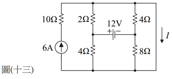 21. 如圖(十三)所示電路,電流I為何? (A)0 A (B)3 A (C)6 A (D)9 A