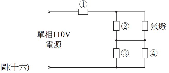 25. 如圖(十六)所示電鍋電路示意圖,主要元件有煮飯加熱片、保溫片、彈跳開關及溫度保險絲,其中①、②、③、④表示元件編號,下列組合何者正確? (A)①為煮飯加熱片、②為保溫片、③為彈跳開關、④為溫度保險絲 (B)①為保溫片、②為彈跳開關、③為溫度保險絲、④為煮飯加熱片 (C)①為溫度保險絲、②為煮飯加熱片、③為彈跳開關、④為保溫片 (D)①為彈跳開關、②為溫度保險絲、③為保溫片、④為煮飯加熱片