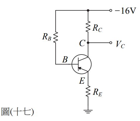 28. 如圖(十七)所示電路,\RB=690kΩ、RC=5kΩ、RE=0.75kΩ,若雙極性接面電晶體(BJT)之β=99、VEB=0.7V,則VC為何? (A)-6.1 V (B)-5.1 V (C)4.2 V (D)8.1 V
