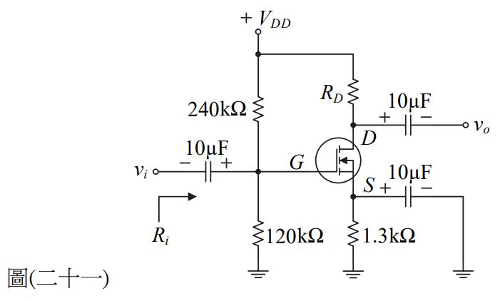 34. 如圖(二十一)所示放大電路,若MOSFET操作於飽和區,則此放大電路之輸入阻抗Ri 為何? (A)360 kΩ (B)240 kΩ (C)120 kΩ (D)80 kΩ
