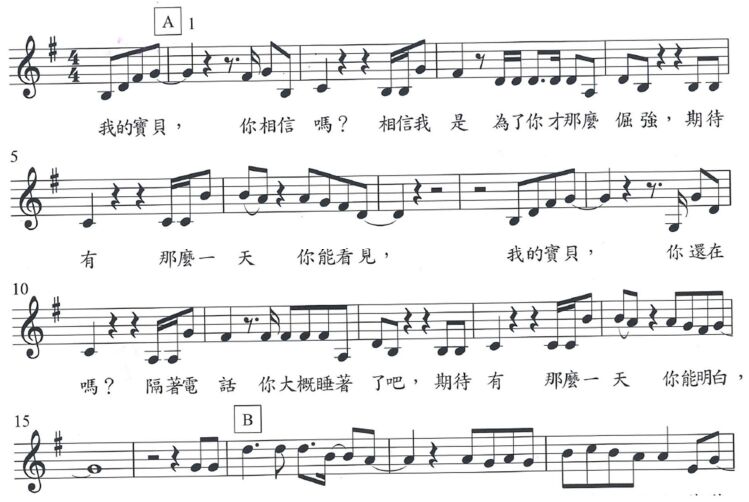 一、實作題:(一)請根據以下譜例之主題旋律,完成開頭至第15小節之 鋼琴伴奏 譜寫。伴奏之和聲配置與形式可自行設計,無須與MV原曲編配相同。請注意,作答時,毋須抄寫主題旋律或歌詞,請直接於答案卷所附空白樂譜上譜寫雙手鋼琴伴奏聲部,並請標示調號、拍號及小節數。