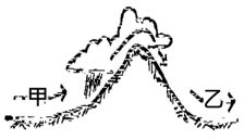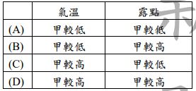 14. 右圖中,空氣流動因地形抬升而在迎風面發生降雨,有關甲、乙兩處之氣溫、露點比較,何者正確?