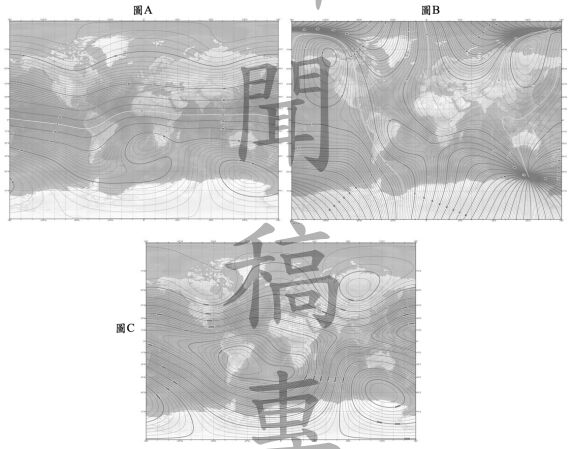 35. 地球磁場可由三個主要要素描述,包括磁偏角(Declination)、磁傾角(Inclination)與磁場強度(Intensity)。下圖為國際地磁參考場(IGRF)所繪製之三種地磁要素分布圖,請問圖A、B、C最可能代表何種地磁要素? (A)A:磁傾角/B:磁偏角/C:磁場強度 (B)A:磁傾角/B:磁場強度/C:磁偏角 (C)A:磁偏角/B:磁傾角/C:磁場強度 (D)A:磁場強度/B:磁傾角/C:磁偏角