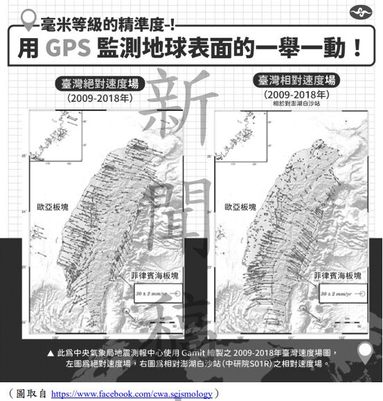 36. 下圖為臺灣2009~2018年GPS速度場,左圖為絕對速度場,右圖為相對於澎湖白沙站的相對速度場。下列敘述何者正確? (A)相對速度場中,臺灣東部與西部箭頭方向相同,顯示全島形變均勻一致 (B)相對速度場是將所有測站速度減去參考站速度,可以呈現臺灣各地相對於歐亞板塊的運動模式 (C)GPS速度場反映的是長期穩定的板塊運動,無法捕捉地震前後的短期地表位移 (D)GPS只能量測地表水平方向的位移,無法偵測垂直方向的地表變動