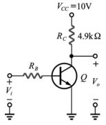23. 如圖所示電晶體電路,若β= 100,VBE(sat) = 0.7 V,VCE(sat) = 0.2 V,Vi= 5 V,則使電晶體停留在飽和區之最大RB值約為多少 kΩ? (A)215 (B)112 (C)76 (D)48