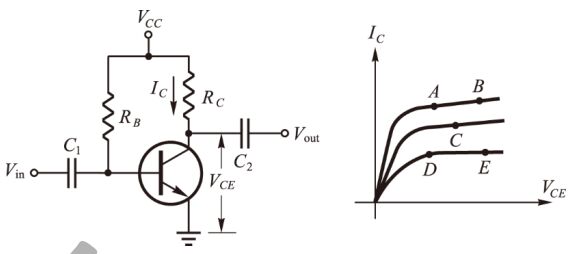 23. 如下圖所示之電路與電晶體輸出特性曲線,在固定電源\( V_{CC} \)下,若原工作點位於C 點,欲將工作點調整至E 點,則應如何調整電路參數?