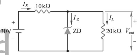 27. 如下圖所示電路,已知齊納二極體ZD之崩潰電壓為10V,且為理想元件,則輸出電壓\( V_{out} \)與齊納二極體電流\( I_Z \)分別為何?