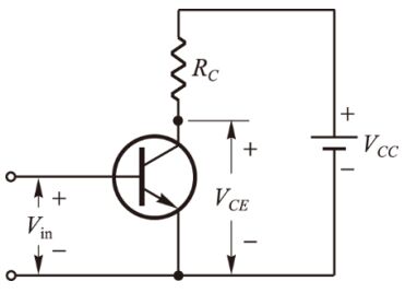 32. 如下圖所示之雙極性接面電晶體(BJT)作為開關控制LED 之電路,已知\( V_{CC}=12V \)、\( V_{in}=5V \)、基極電阻為10kΩ、電晶體電流增益β=200,LED 導通電壓為1.8V,並假設\( V_{BE}=0.7V \)、\( V_{CE(sat)}=0.2V \)。若設計\( R_C=1k\Omega \),則下列敘述何者正確?