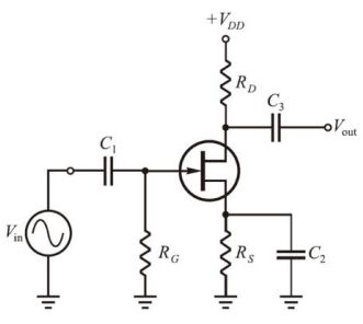 30. 如下圖所示之共源極(Common-Source)放大器,若將源極旁路電容\( C_2 \)移除,則其小信號電壓增益之變化為何?