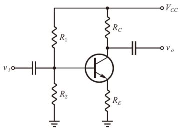 31. 如下圖所示之雙極性接面電晶體(BJT)共射極放大器,在中頻小信號條件下,輸入電壓與輸出電壓\( V_0 \)之相位關係為何?