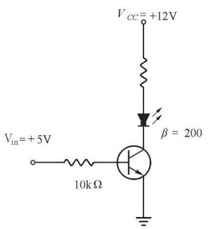 (A)電晶體工作於放大區 (B)電晶體工作於飽和區 (C)LED 電流小於10 mA (D)基極電流不足以驅動電晶體
