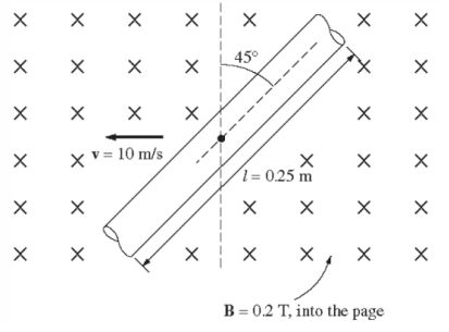 44. 如下圖所示,一導線長度為0.25 m,置於均勻磁場中(B=0.2 T 方向垂直紙面向內)。導線以速度v=10 m/s 向左運動,且導線與垂直方向夾角為45°。試問導線中所感應之電壓大小及極性為何?