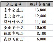 (三)請寫出一個 SQL 查詢,列出各分店名稱及其總銷售金額,查詢結果如下表所示,資料需以總銷售金額遞減排序。註:銷售金額=商品銷售數量×商品單價。