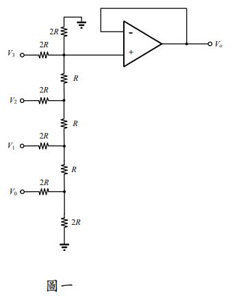 一、有一個理想運算放大器(Operational Amplifier)電路如圖一所示,輸入電 壓信號分別為 V0、V1、V2 與 V3,輸出電壓信號為 Vo。電路中 R = 10kΩ。 請計算 Vo。(25 分)