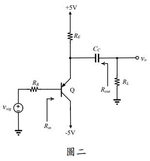 二、圖二為一個 pnp 雙載子接面電晶體(BJT)電路,電晶體 Q 的參數如下: β = 100,ro = ∞,VT = 25mV,如果電晶體 Q 導通,其 VEB = 0.7V。電路 中,RB = 100kΩ,RE = 5kΩ,RL = 2kΩ,CC 是一個耦合電容,其值為∞。 請計算輸入電阻 Rin、輸出電阻 Rout 與電壓增益 vo/vsig。(25 分)