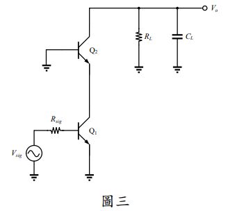 三、圖 三 為 一 個 npn 雙 載 子 接 面 電 晶 體 ( BJT ) 疊 接 放 大 器 ( Cascode Amplifier)電路,電晶體 Q1 與 Q2 皆工作在主動模式(Active Mode) 下。為計算方便,未顯示其偏壓電路,但已知 IC2 = 1 mA。電晶體 Q1 與 Q2 的參數如下:β1 = β2 =100,VA1 = VA2 = 150 V,VT1 = VT2 = 25 mV, Cπ1 = Cπ2 = 15 pF,Cμ1 = Cμ2 = 0.3 pF,CS1 = CS2 = 0。電路部分,Rsig = 2 kΩ, RL = 4 kΩ,CL = 20 pF。請計算中頻增益 AM 與上 3dB 頻率 fH。(25 分)