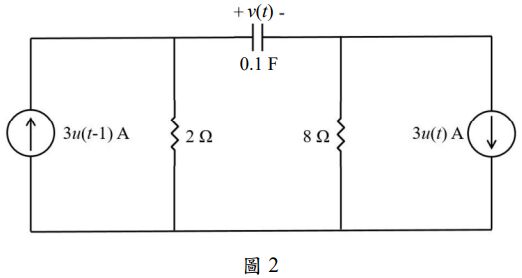 二、若 v(0) = 0 V,試求圖 2 電路中 t > 0 時的 v(t)。(25 分)