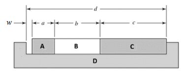 一、圖示為三個矩形零件與一開槽零件的組合,其中 a、b 及 c 分別代表三個矩形零件的長度,d 係開槽零件的槽孔長度,w 為矩形與開槽零件組裝後的間隙。若已知該四個零件的基本尺寸與公差分別為 a = 36.6±0.025 mm、b = 50±0.075 mm、c = 63±0.15 mm 及 d = 150±0.25 mm,求組裝後間隙 w的最大值及最小值。當零件 B、C 及 D 的尺寸,以及各個零件的公差維持不變,要確保組裝後間隙 w ≧ 0.3 mm 時,求零件 A 所需之長度 a 的基本尺寸。(25 分)