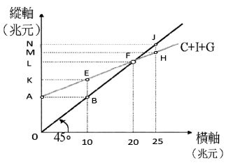 (A)自發性支出為 10 (B)所得為 10 時,所得等於產出 (C)所得為 20 時,支出等於產出 (D)所得為 25 時,支出高於產出