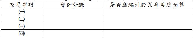 試作:上述交易事項,請依政府會計公報及中央公共債務會計處理參考指引等規定,以下表所列格式,列示在各交易事項發生時,財政部應有之會計分錄。(17 分)又上述交易事項依預算法規定,是否應編列於 X 年度總預算內有關「債務之舉借」與「債務之償還」之數額(該欄僅回答「是」或「否」即可)。(8 分)