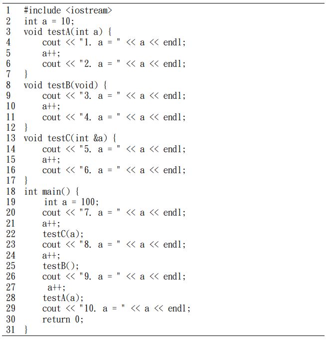 一、請追蹤下列根基於 C++所撰寫的程式,列出輸出結果,每項輸出皆要說明為何會輸出所對映數值的原因,受那些規則或副程式所決定的結果。(30 分)