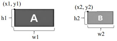 二、給定二個方形,方形 A 的左上角座標(x1,y1),寬和高為(w1,h1);方形 B 的左上角座標(x2,y2),寬和高為(w2,h2),請設計判斷邏輯,以確認二個方形是否有任何重疊,有重疊回傳 true,否則為 false。(20 分)