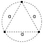 Consider a system in outer space consisting of three planets, each with mass m, located at the vertices of an equilateral triangle with side length a, as shown in the figure. The three planets form an isolated system. Each planet moves with uniform circular motion along the circumcircle of the triangle, orbiting the center of mass of the system. Find the period of rotation of this system.