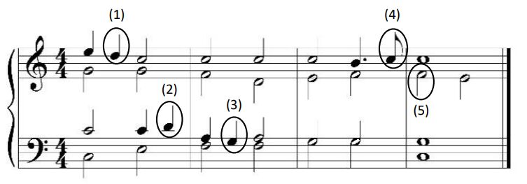 (A)(1)-經過音 (B)(2)-駢枝音 (C)(3)-鄰音(D)(4)-先現音 (E)(5)-倚音