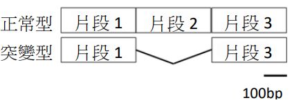 5. 如右圖所示,小鼠正常基因 X 的基因體 DNA 是由三個片段所組成,而在 突變個體的基因型中,基因 X 則僅剩下兩個片段,片段 2 則在基因體中被 剔除。若要檢測小鼠是否具有此突變後基因 X 的基因型,可能會用到下列 哪些方法?(A)聚合酶連鎖反應(PCR)(B)染色體檢驗的核型分析 (C)基因 體核苷酸定序 (D)特定基因的基因改造(E) DNA 電泳鑑定。