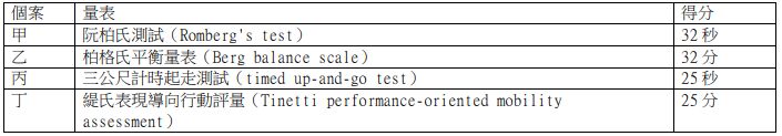 77.下列何評估結果顯示有高跌倒風險? (A)甲乙 (B)乙丙 (C)丙丁 (D)甲丁