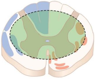 45.70 歲的林奶奶在浴室跌倒頸部受傷導致 C6 不完全損傷(如圖虛線內部分),下列敘述何者正確?(A)同側的本體感覺受損比對側嚴重 (B)上肢動作功能受影響比下肢嚴重 (C)下肢動作功能受影響比上肢嚴重 (D)完全保留本體感覺但痛覺溫度覺喪失
