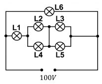 5. 如下圖所示,6盞完全相同燈泡⊗的連接線路,各燈泡的規格均為100V、20W,則下列敘述哪些正確?(全對才給分) (A)L1燈泡兩端電壓為50伏特 (B)若拿掉L5燈泡,則L3燈泡會變亮 (C)若拿掉L5燈泡,則L2燈泡會變亮 (D)若拿掉L5燈泡,則L1燈泡會變暗 (E)若拿掉L6燈泡,則L1燈泡會變亮