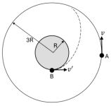 3. 如下圖所示,某一半徑為R的行星有一離地高度為2R的衛星A,以速率v環繞該行星轉動。假設行星本身沒有自轉,今在該行星表面上沿著水平方向發射一枚火箭B,欲使之與衛星A會合。若火箭發射後,即不再具有動力,則火箭B在發射時的速率為v'其最小值需為何?(以v表示)