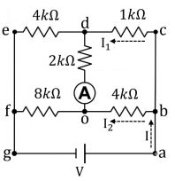6. 在下圖的電路中,假設忽略安培計的內電阻,當安培計讀數為3 mA向下流時,且cd間電流為I₁,bo間電流為I₂,ab間電流為I,電流方向如圖所示,求出a、g兩點的電位差為多少?