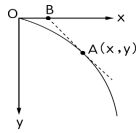 11. 如圖所示,物體自原點O(0,0)作水平拋射運動的軌跡,於此曲線上任意一點A(x,y)作過此點軌跡的切線交x軸於B點,則B點與原點O之間的距離為?